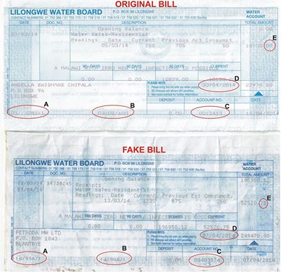The original bill contains customers plot number, Area/Book/number whilst the fake bill contains a repetition of the plot number and the original water bill depicts the last date of the month while the fake does not.