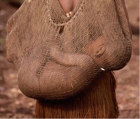 The pictures show the Korowai people of West Papua in Indonesia building their treehouses, marching off to hunt and carrying their children in huge nets over their shoulders.