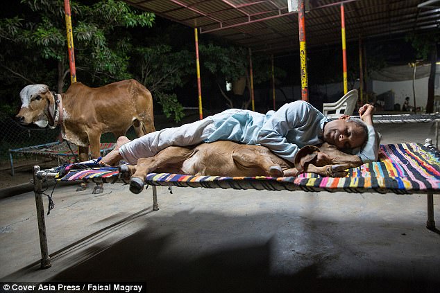 Vijay Parsana, 44, is so obsessed with his cows he bathes, eats, watches television and shares his bed with them. He even drinks their urine and dung claiming its good for his health and that he once survived for 22 days on cow’s urine alone.