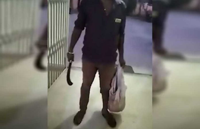 Branding a machete the 35-year-old stood in the police station while a stunned officer filmed on his mobile phone.