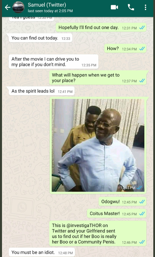 Screenshots of the hilarious Whatsapp chats from the investigation revealed how the lady’s boyfriend was tested and he failed woefully.