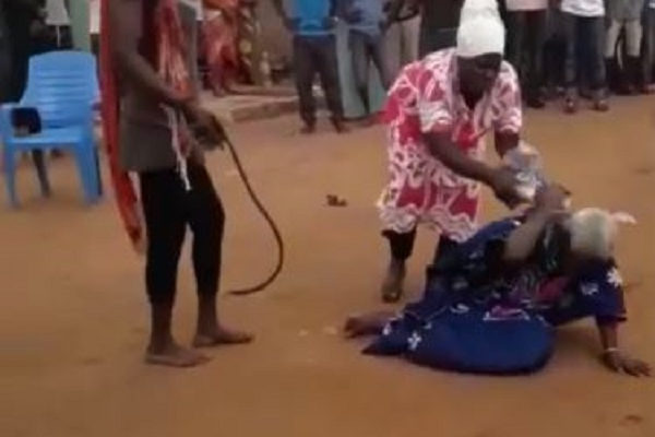 It is unclear what prompted the supposed soothsayer to accuse the old woman of witchcraft and her subsequent lynching but scenes in the video can only be described as barbaric. The disturbing video has younger women, slapping, whipping and hitting the old woman’s head with a heavy item, with the community members cheering them on.