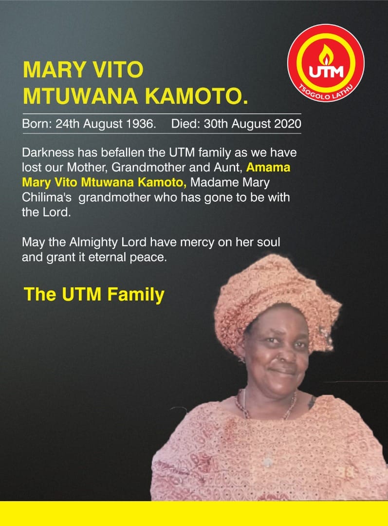 “Darkness has befallen the UTM family as we have lost our Mother, Grandmother and Aunt, Amama Mary Vito Mtuwana Kamoto, Madam Mary Chilima’s grandmother who has gone to be with the Lord.
