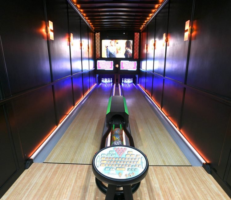 Luxury Strike Bowling consists of a dual automatic bowling lane, scoring system, temperature control, neon lighting, 80-inch theater screen, a sky lounge and a state-of-the-art sound system. Because of size constraints, the two lanes are shorter than those of traditional bowling alleys, and the bowling balls are smaller and slightly lighter than regular ones.