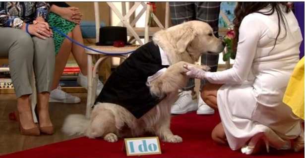 The “blessing” was officiated by TV crew members, and the bizarre ceremony also saw one of them play ring bearer. One of the hosts walked the bride down the aisle. After an exchange of rings and a bracelet, came the vows and then a kiss between the woman and dog.