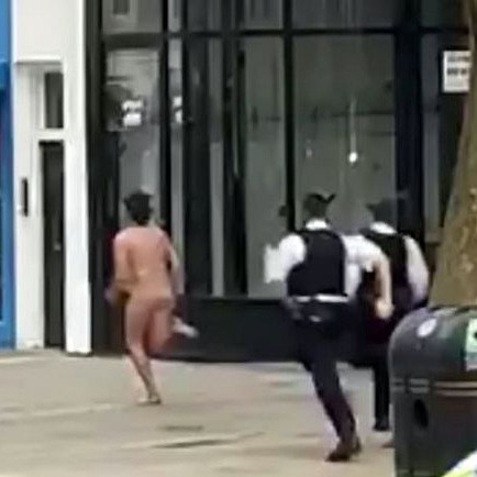 Footage shows three cops desperately trying to catch the naked man as he screams and darts past shops and businesses with nothing on.