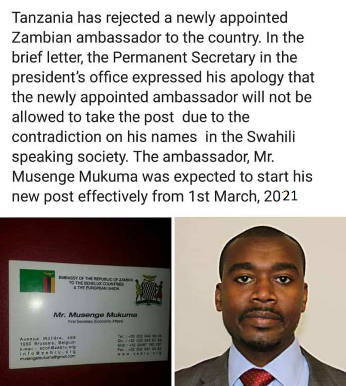 Zambian Diplomat Musenge Mukuma has been Rejected By Magufuli Because His Names Are Insults In Swahili.