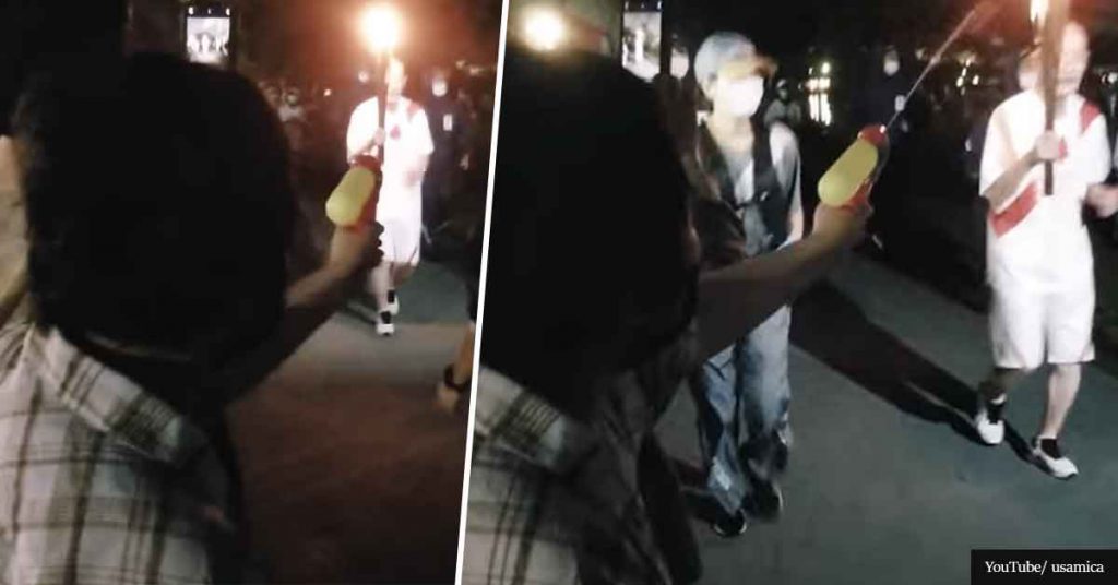 The incident happened last Sunday and was captured on video. It shows a 53-year-old woman firing a water gun at the Olympic torch as it was being carried by a 77-year-old runner.