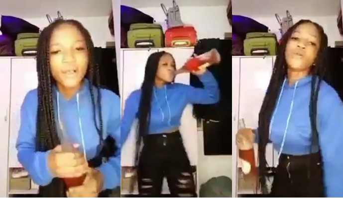 The young lady has shared a video of herself celebrating in a special way after seeing her monthly cycle with a bottle of wine and while jumping in excitement as she danced to music blaring loudly in the background.