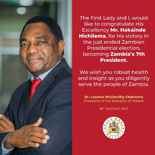 President Dr. Lazarus Chakwera has congratulated the newly elected President of Zambia Hakainde Hichilema.