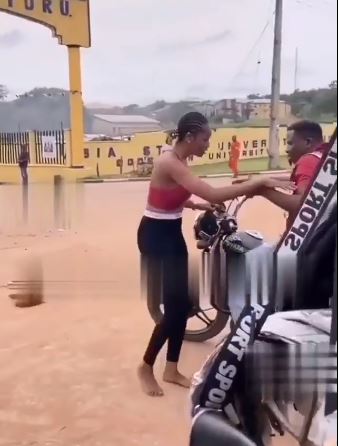 Immediately she got off from the motorbike, she held her head as if she is getting some pains in the head. The lady then removes her slippers, wigs and her top shirt.