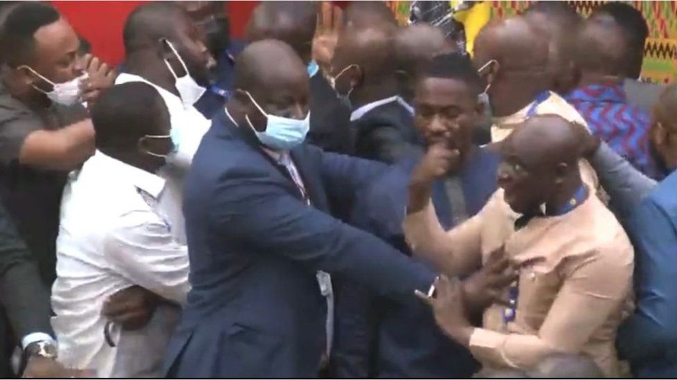The chaos started after opposition MPs rushed forward to prevent Deputy Speaker Joseph Osei Owusu from leaving his seat to vote, local media reports.