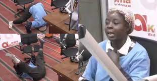 60-year-old woman cries whiles she demonstrates on Live radio the doggy style a Mallam gave her at his shrine where she had gone to seek medical help