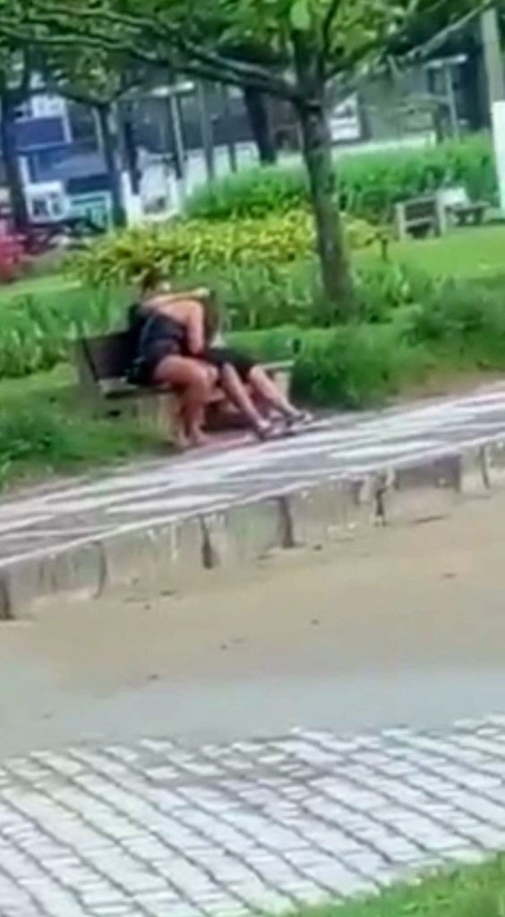 The couple were also filmed, still fully clothed, sitting on the bench as the woman performs a sex act on the man.