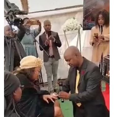 In a video shared to TikTok, the man goes on both knees and produces a ring in the middle of the funeral in South Africa to ask the grieving woman to marry him.