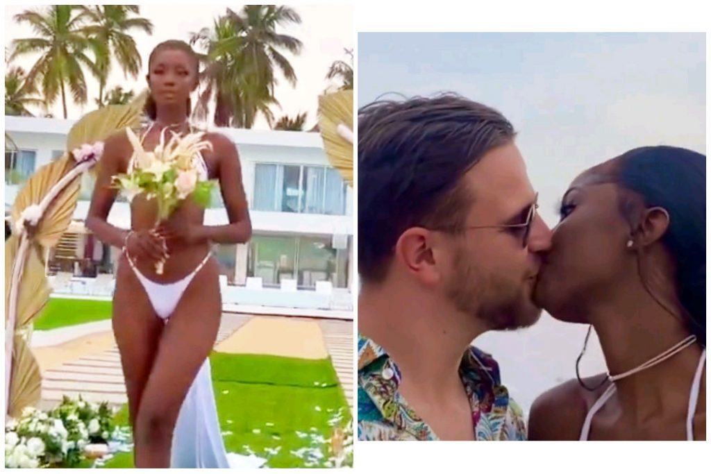 The couple shared a kiss after they were joined and they celebrated their union with flowers as they play on the beach. The video has sparked mixed reactions after Tunde Ednut asked if people like the couple’s style of wedding.