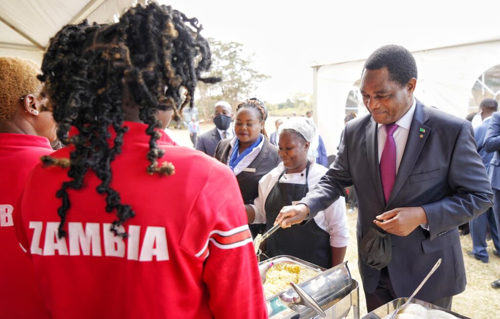 President Hakainde Hichilema is trending on social media after sharing photos showing him serving food to Zambia Women Football Team.