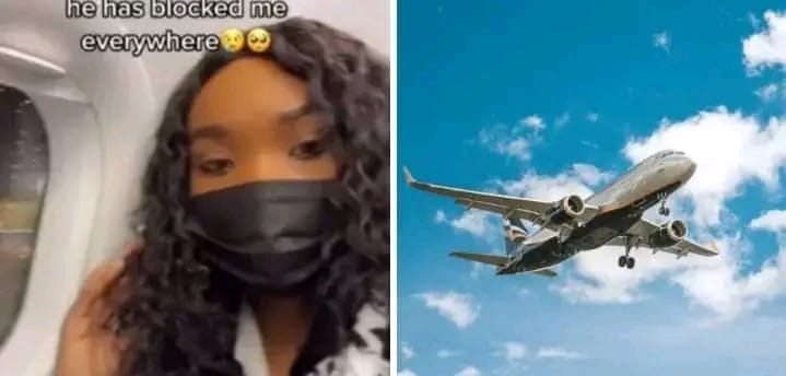 The lady shared a video of herself aboard the plane and wrote; ”Guys I have traveled 7 plus hours to go meet this stranger we met online and he has blocked me everywhere.”