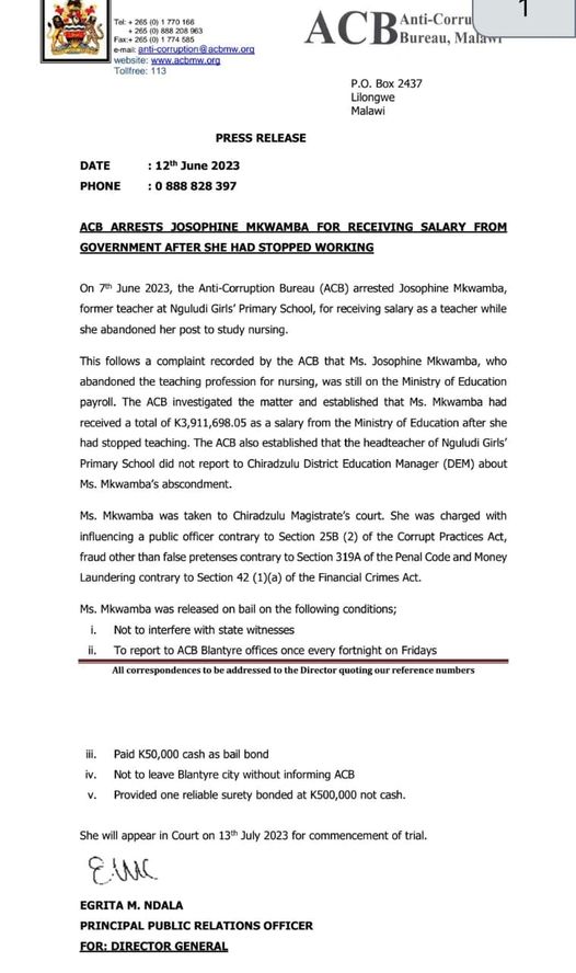 ACB’s principal public relations officer, Egrita Ndala, revealed that the arrest took place on June 7, 2023, following a complaint lodged against Mkwamba.