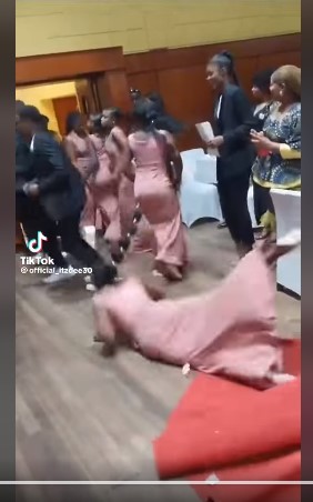 A joyous bridesmaid is trending on social media after suddenly fall to the ground while making an entrance during a wedding ceremony.