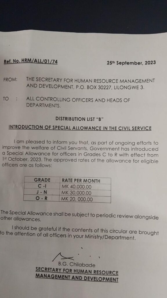 According to a letter from the Secretary for Human Resource Management and Development, Blessings Chilabade, to all controlling officers and heads of departments, government has introduced the special allowances as part of its ongoing efforts to improve civil servants welfare.