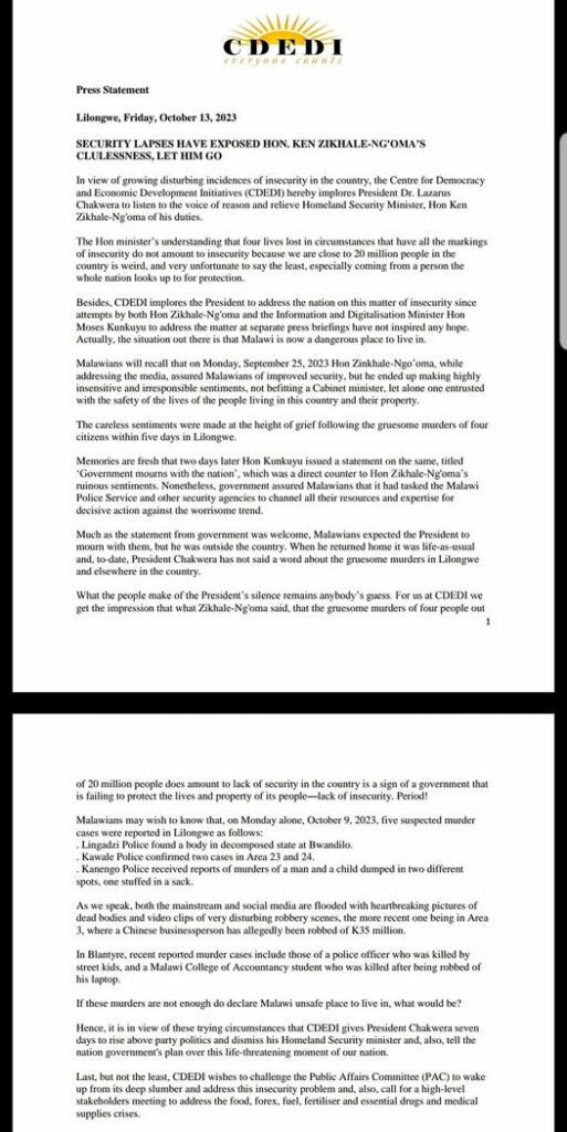 The Centre for Democracy and Economic Development Initiatives (CDEDI) has issued a 7-day ultimatum to President Lazarus Chakwera, demanding the removal of Homeland Security Minister Ken Zikhale Ng’oma due to perceived failure in managing the country’s security situation.
