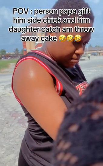 “POV: person papa gift him side chick and him daughter catch am throw away cake,” the video caption read.
