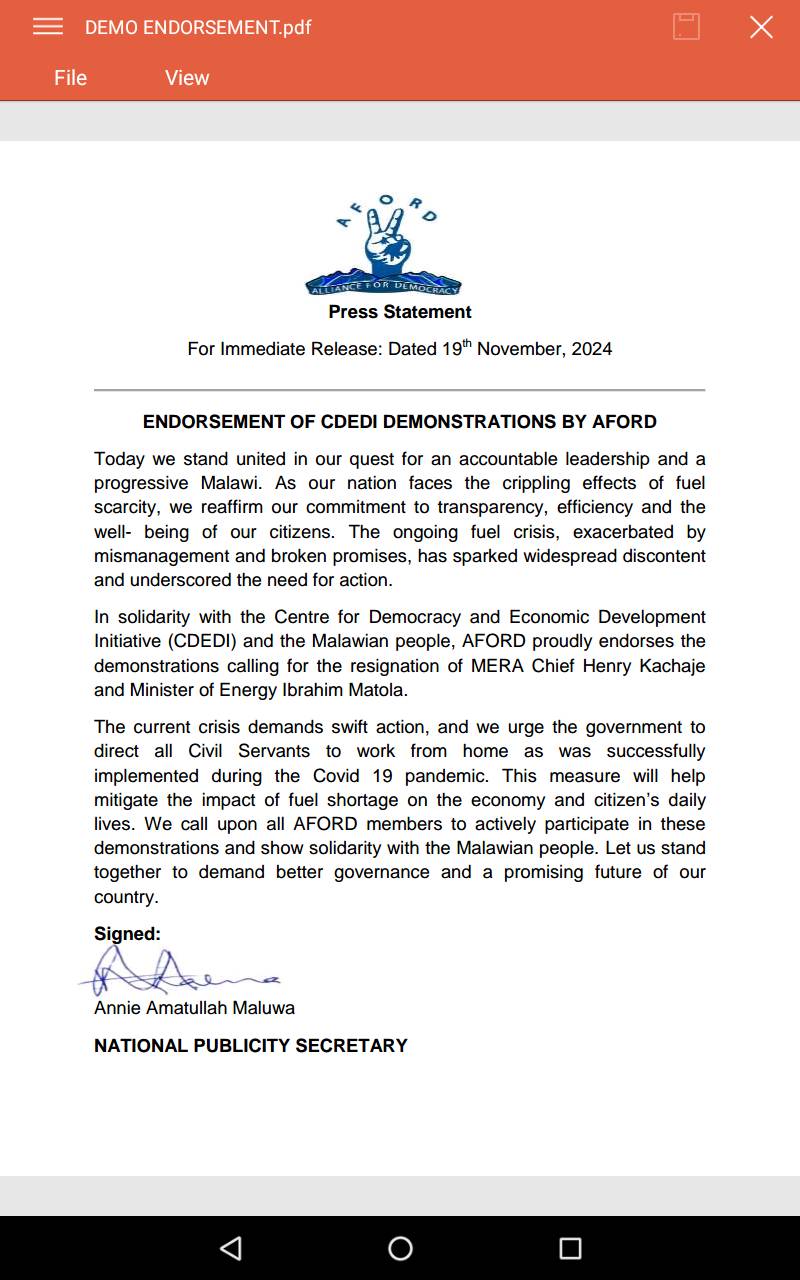 The Alliance for Democracy (AFORD) has called on its members to join the demonstrations organised by the Centre for Democracy and Economic Development Initiative (CDEDI). The protests are aimed at demanding the resignation of Energy Minister Ibrahim Matola and MERA CEO Henry Kachaje due to the ongoing fuel shortage crisis in the country.