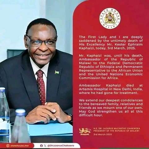 President Lazarus Chakwera and First Lady Monica Chakwera have expressed their deep sadness over the ambassador’s passing, extending their condolences to the bereaved family, relatives, and friends.