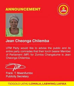 The United Transformation Movement (UTM) has announced that Jean Cheonga Chilemba is the torchbearer for Zomba Changalume Constituency in the […]