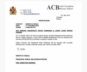 The Anti-Corruption Bureau (ACB) has arrested Magistrate Philip Chibwana from Balaka District, along with his clerk Feston Chauma, on suspicion […]