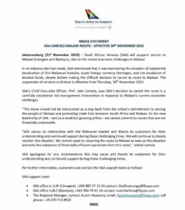 South African Airways (SAA) has announced the temporary termination of its services in Malawi due to recent economic challenges. In […]