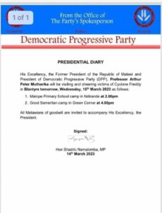 Former President Peter Mutharika who is also leader of the opposition Democratic Progressive Party (DPP) is today expected to visit […]