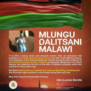 Beatrice Eunice Sauka, wife to the composer of the Malawi national anthem late Micheal Sauka, has died. Matoni Kukada, a […]