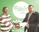 Carlsberg Malawi Senior Brands Manager alcoholic Twikale Chirwa presented a cheque to Bullets General Secretary Higger Mkandawire on Wednesday.