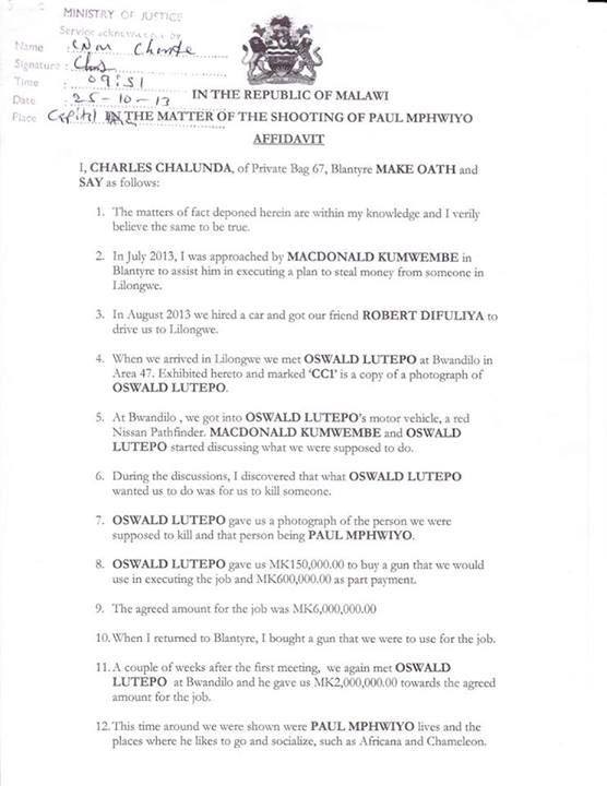 One of the men contracted to take the life of Budget Director, Paul Mphwiyo, has confessed to the Police that businessman Oswald Lutepo promised them MK6 million for the head of Mphwiyo. In an affidavit that FaceofMalawi has in custody, the hitman, Charles Chalunda, has denied taking part in the shooting but has made shocking revelations as outlined below: