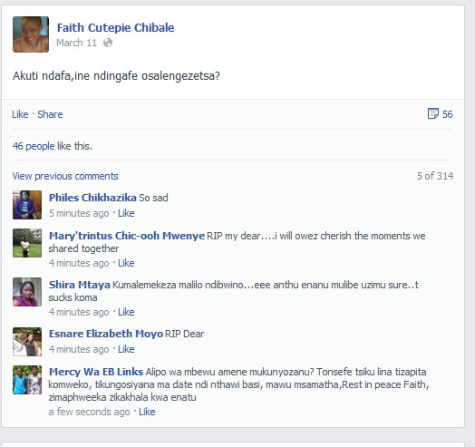 Faith Chibale 25, passed on today at Queens Elizabeth Central Hospital after a long illness.