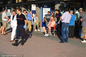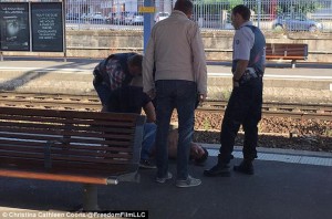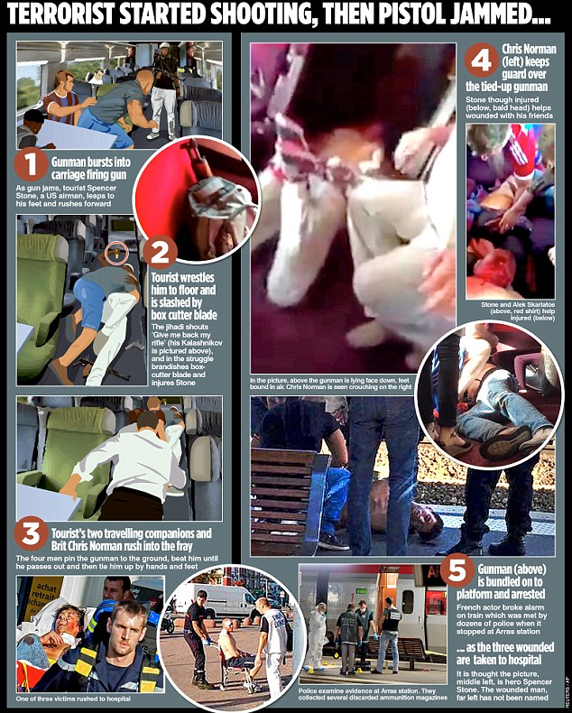 But despite his injuries Mr Stone gave first aid to another man bleeding heavily from a neck wound before the train made an unscheduled stop in the northern French town of Arras ten minutes later, where it was met by dozens of armed police and paramedics.