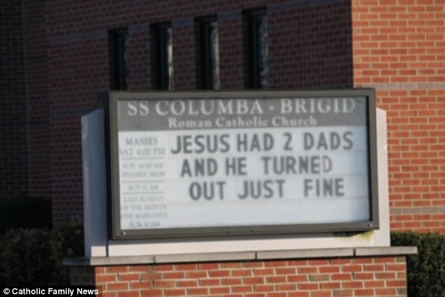 St Columbia-Brigid Roman Catholic Church in Buffalo, New York put up the sign last week with the message, ‘Jesus had 2 dads and he turned out just fine’.