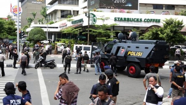 Details remain unclear, but at least one of the blasts hit a Starbucks cafe outside the Sarinah shopping centre and next to a police security post.