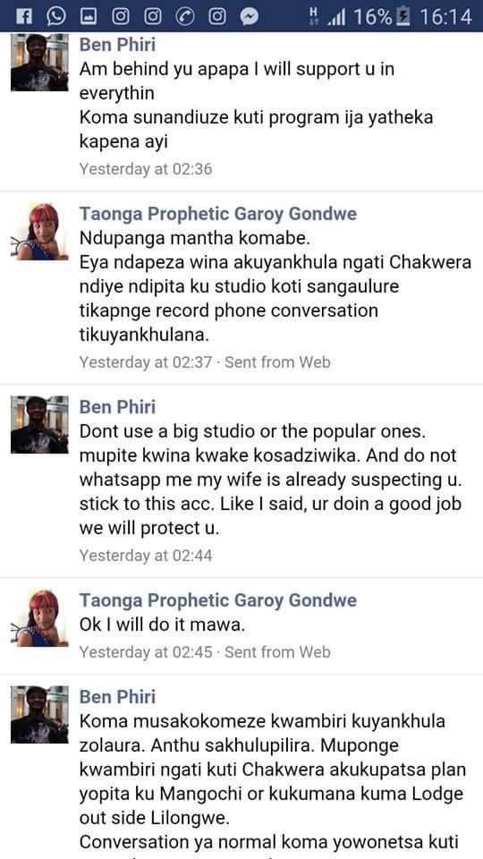 According the leaked conversation accompanied with semi-naked photos of young girl posing as Taonga Prophetic Garoy Gondwe, Phiri tells the lady make intimate conversations with another cadet to be paid mimicking Rev. Dr. Lazarus Chakwera.