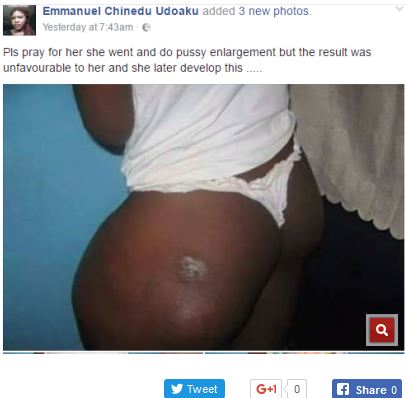 “Please pray for her. She went and did ‘pussy’ enlargement but the result was unfavourable to her and she later developed this.