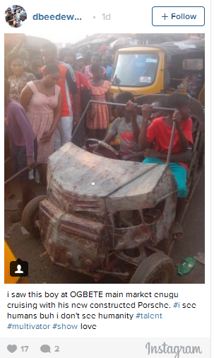@dbeedeewhyteboy wrote: “I saw this boy at OGBETE main market enugu cruising with his new constructed Porsche. #i see humans buh i don’t see humanity #talent #multivator #show-love.”