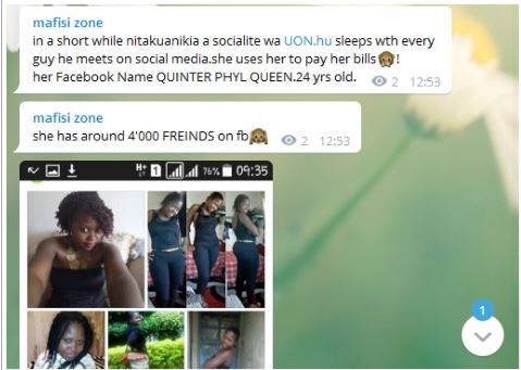 “She sleeps with every guy she meets on social media. She uses body to pay bills,” reads a post on Mafisi Telegram Channel.