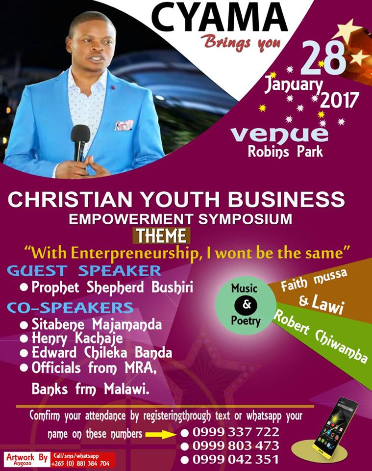 The advert issued by CYAMA which faceofMalawi has seen indicates that Faith Mussa , Lawi, real name Francis Phiri and poet Robert Chiwamba are scheduled to perform at the said event where Enlightened Christian Gathering (ECG) Church founder Prophet Bushiri will be the Guest Speaker.