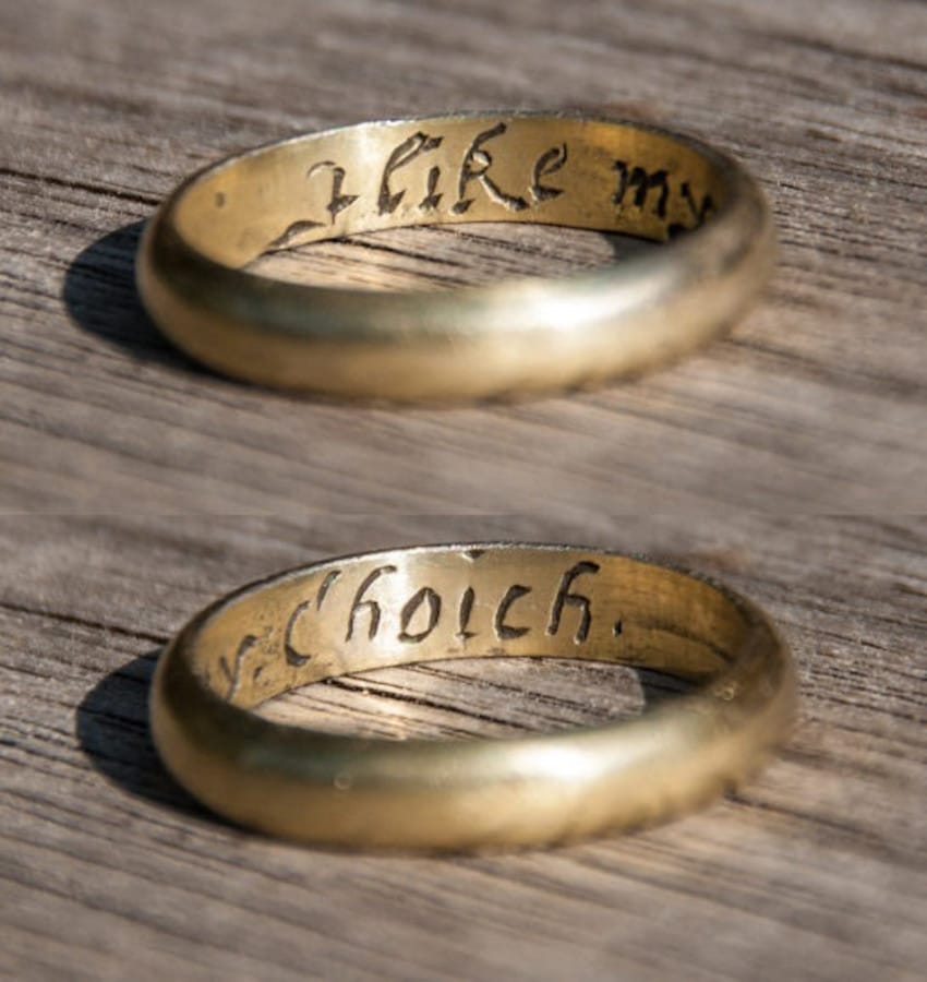 In the 1600s and 1700s, lovers might exchange silver or gold bands with lines of poetry inscribed on the inside or outside of the band, which in turn were called “poesy rings.” During this time, a silver band was sometimes given out upon an engagement, and switched out for a gold one once the couple was married.