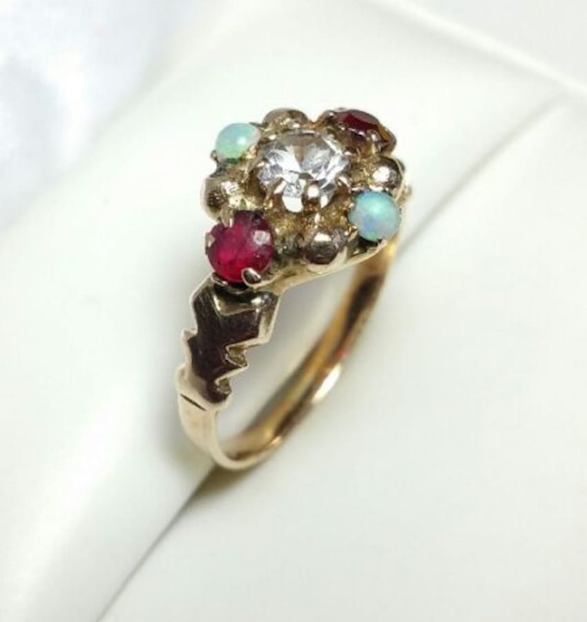 Victorian England was a very romantic time and place, in part because Queen Victoria really loved her husband, Albert. This brought about a very flowery outlook on relationships, and engagement rings from this time period featured a lot of floral designs, as well as bows and colorful gemstones. Victorian engagement rings certainly do not lack in imagination.