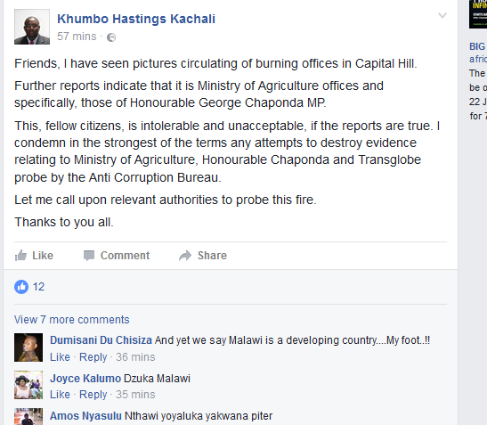 “Friends, I have seen pictures circulating of burning offices in Capital Hill. Further reports indicate that it is Ministry of Agriculture offices and specifically, those of Honourable George Chaponda MP.