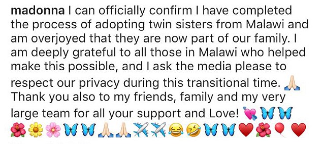 The High Court in Lilongwe two weeks ago granted Madonna a go ahead to adopt Malawian twins, namely Esther and Stella.