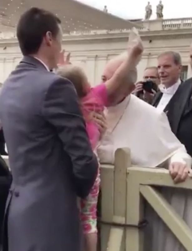 Luckily for everyone the Most Holy Father saw the funny side and joined in with the laughter, swiftly retrieving his head garment from the girl.